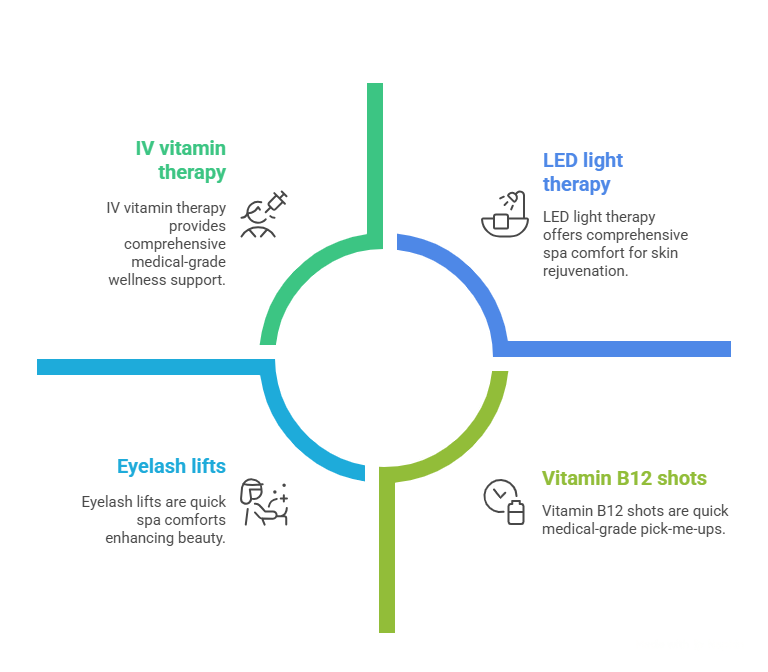 Besides these core treatments, med spas often include wellness and quick-enhancement services that clients love. For example, many offer IV vitamin therapy or hydration drips, which infuse high-dose vitamins, fluids and antioxidants directly into the bloodstream. People use these drips to boost energy, recover from workouts or hangovers, and support overall wellness. Quick injectables like vitamin B12 shots are also common pick-me-ups. Other add-ons include LED light therapy (to help skin heal and rejuvenate after treatments) and simple beauty services like eyelash lifts or brow tints. While these may seem small, they add to the med spa experience and are popular with clients who want an extra boost of confidence or relaxation. In short, med spas bundle medical-grade treatments with spa comforts – the result is a menu full of popular options that make you look and feel great.